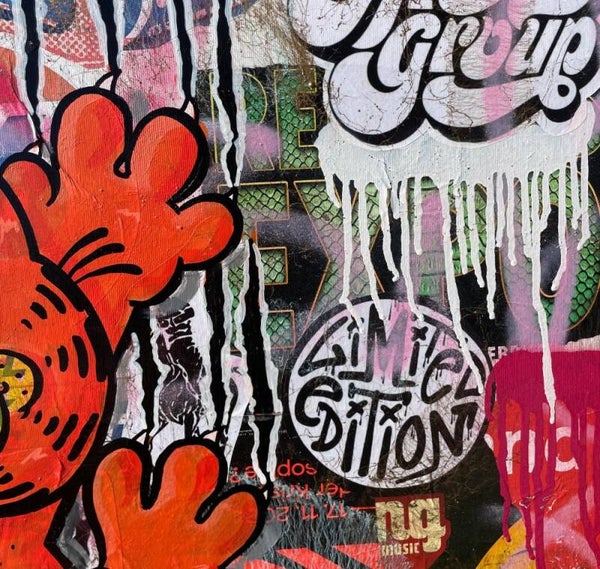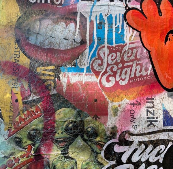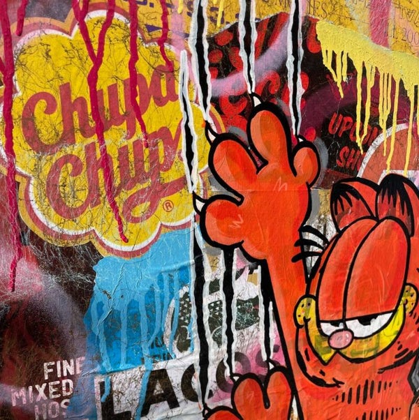 Bei diesem Werk wurde der Fokus in erster Linie auf den Hintergrund gesetzt. Dieser besteht aus vielen abgerissenen Werbeplakaten. Darüber wurde dann alles zusätzlich mit Graffitispray verschönert. Garfield habe ich mit Acrylfarben und Markern gemalt. Das Bild wurde auf einem 1.8 cm dicken und bespannten Keilrahmen gefertigt.
