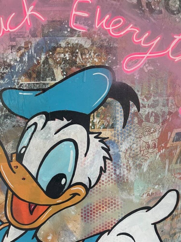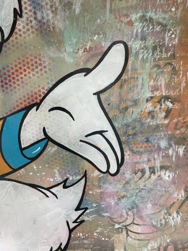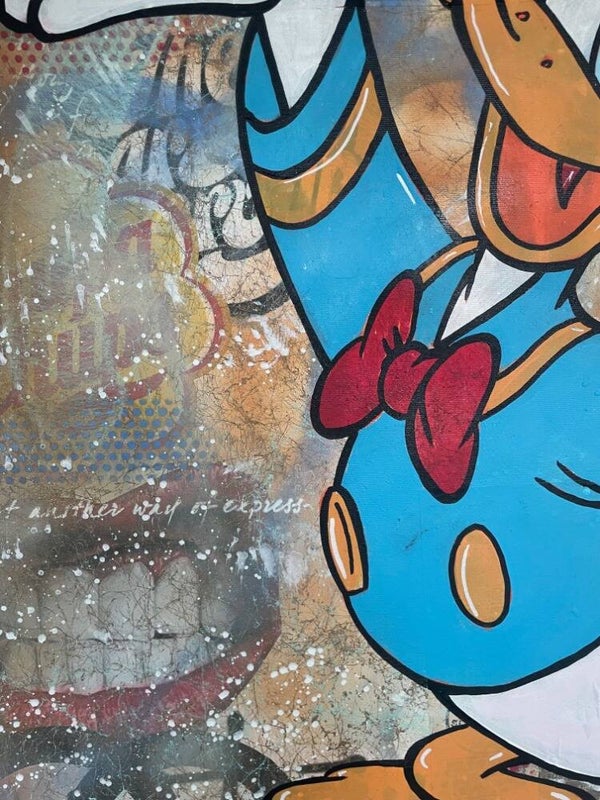 Für das Motiv wählte ich ein humorvolles Bild des berühmten Donald Duck. Im Hintergrund sind viele Werbungen, über die ich gesprüht habe. Donald Duck habe ich mit Acrylfarben und Markern gemalt. Das Werk wurde auf einem 1.8 cm dicken, gespannten Keilrahmen gefertigt.